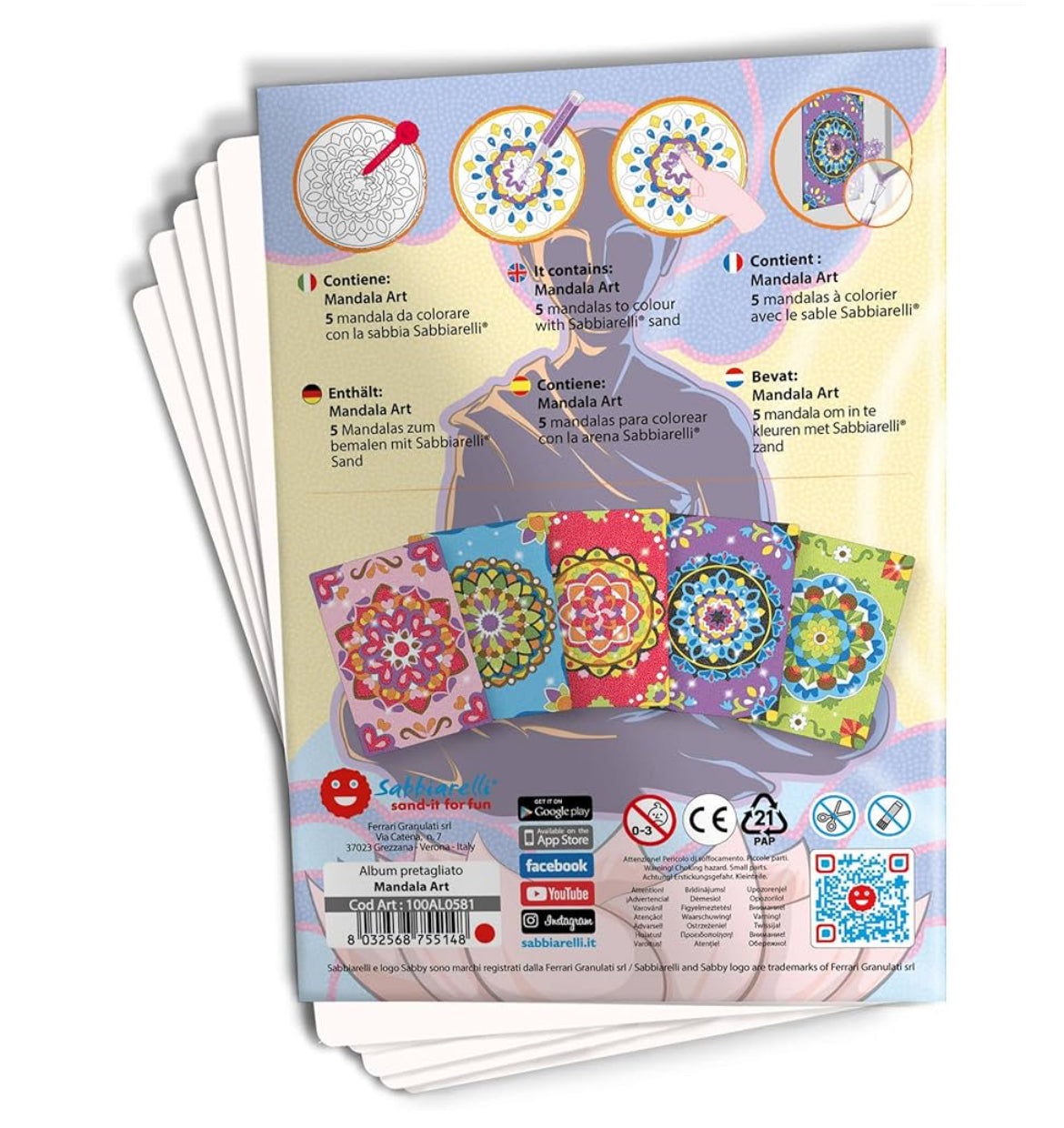 Non servono né forbici, né colla: rimuovendo la carta dal disegno rimane la superficie adesiva da colorare con le sabbie Sabbiarelli® (sabbia non inclusa da acquistare in aggiunta sempre sul nostro shop).